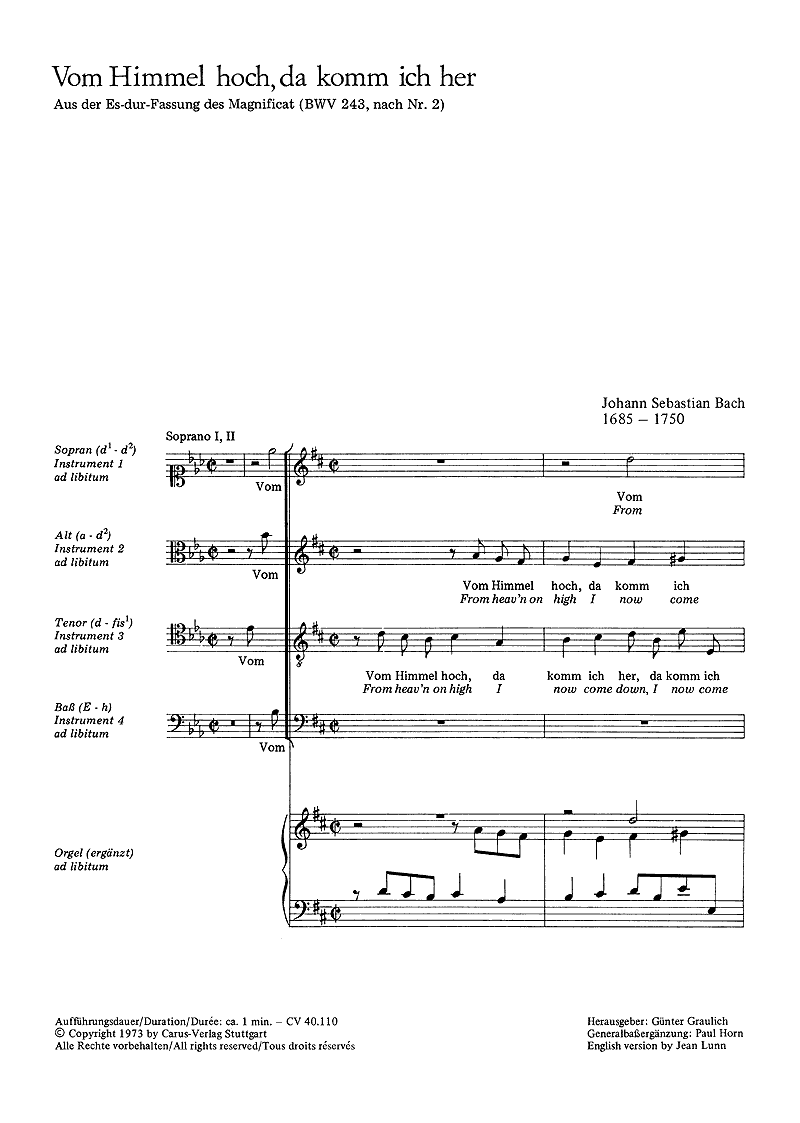 Vom Himmel hoch, da komm ich her (coro SATB; optional; 4 Instrumente; colpart; ]; organo), partitura