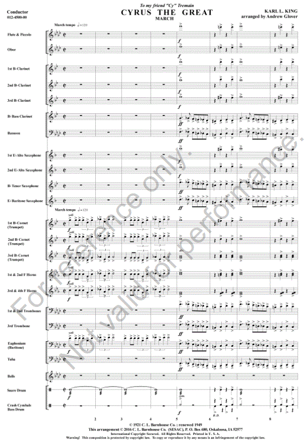 Ulteriori informazioni / contenuti La marcia "Cyrus The Great" di Karl King è stata una delle preferite dalle bande per quasi un secolo, e questa Karl L. King Centennial Edition di Andrew Glover dà nuova vita a questa marcia classica! A lungo preferita dalle bande da circo, con le sue ponderose linee di ottoni bassi e le inquietanti tonalità in chiave minore, questa marcia coinvolgente offre a tutte le sezioni l'opportunità di mostrare il proprio virtuosismo tecnico e musicale. A riprova del fatto che non tutte le marce hanno lo stesso suono, "Cyrus The Great" delizierà e impressionerà il vostro pubblico dall'inizio alla fine.