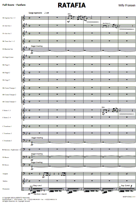 Ulteriori informazioni / contenuti Questa composizione è stata scritta per celebrare il 75° anniversario della Royal Harmony of the Friends of Oostham (Belgio) ed è dedicata al direttore d'orchestra, ai musicisti e al consiglio di amministrazione. Il termine "ratafia" risale al XVII secolo e significava qualcosa come "che tu possa stare bene". Oggi, ratafia è il nome di un liquore.