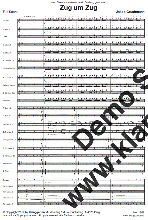 Ulteriori informazioni / contenuti La composizione di Jakob Gruchmann "Zug um Zug" (Treno e treno), scritta nel 2011 per l'Associazione dei musicisti ferroviari di Salisburgo, è un'opera a programma per orchestra di fiati che descrive musicalmente lo sviluppo della ferrovia. In tre sezioni contrastanti, vengono rappresentate musicalmente la locomotiva a vapore, una stazione ferroviaria notturna e la moderna locomotiva elettrica. Il canto popolare del Württemberg "Auf de' schwäbische Eisebahne" (Sulla ferrovia sveva) funge da filo conduttore, collegando il romanticismo storico delle ferrovie alla tecnologia moderna. L'opera colpisce per la sua precisione tecnica e la densità atmosferica ed è particolarmente adatta a ensemble con un legame con la storia delle ferrovie.