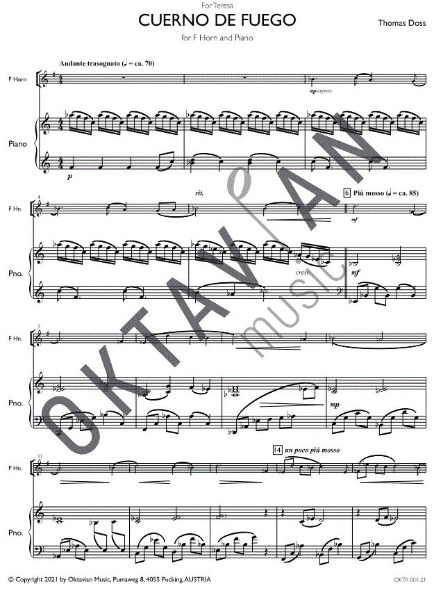 Ulteriori informazioni / contenuti Cuerno de Fuego (Corno di Fuoco) è un piccolo pezzo spiritoso per corno e pianoforte nella gamma di difficoltà media. Un'introduzione sognante conduce ad una selvaggia Con Fuoco che invita a ballare.