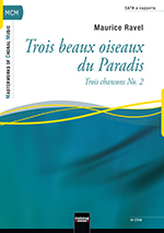 Ulteriori informazioni / contenuti In Trois beaux oiseaux du Paradis (Drei schöne Vögel aus dem Paradies) thematisiert Maurice Ravel den Ersten Weltkrieg, den er bei der Komposition im Winter 1914/1915 unmittelbar vor Augen hatte. In balladenhaftem Erzählton wird das Leid eines Mädchens geschildert, dessen Geliebter in den Krieg gezogen ist. Der klagend-melancholische Charakter der abwechselnd auf alle Stimmregister verteilten Solostimme steht dabei dem in fließenden Vokalisen verlaufenden Chorsatz gegenüber. Quint- und Quartklänge prägen die Klangkulisse des melancholischen Stückes und verorten es mit ihrem historisierenden Charakter im Kontext der Tradition der französischen Renaissance-Chanson.