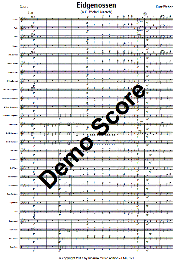 Ulteriori informazioni / contenuti Il termine "Confederati Svizzeri" simboleggia i valori fondamentali della Svizzera: unità, libertà e solidarietà. L'omonima marcia di Kurt Weber riprende musicalmente questi valori e li esprime in un modo che unisce tradizione e modernità. Per le orchestre di fiati e le bande di ottoni di livello intermedio, la marcia è la scelta ideale per celebrare e condividere musicalmente la ricca cultura svizzera. La marcia "Eidgenossen" fornisce un importante contributo alla salvaguardia del patrimonio culturale e alla promozione del senso di comunità attraverso la musica.