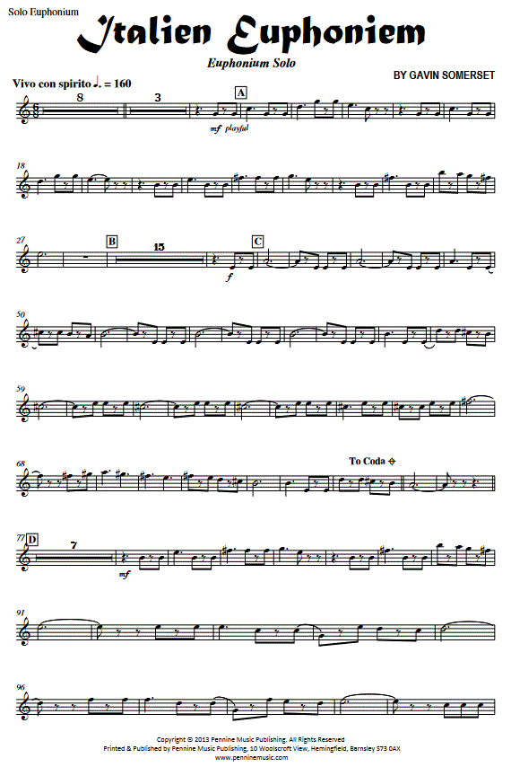 Ulteriori informazioni / contenuti Occasionally, a solo comes along that allows the performer to show off their skill, whilst allowing the band a licence to enjoy themselves too. From the pen of Gavin Somerset comes a solo that takes all the 'bravissimo' of the great Italian composers and delivers a piece that both the audience and performers can enjoy. This original work is written with tongue placed firmly in cheek in this playful, light-hearted take on Italian music with a built in fun factor. The work is a must for both Euphonium soloists and bands looking to add a playful item to their programme
