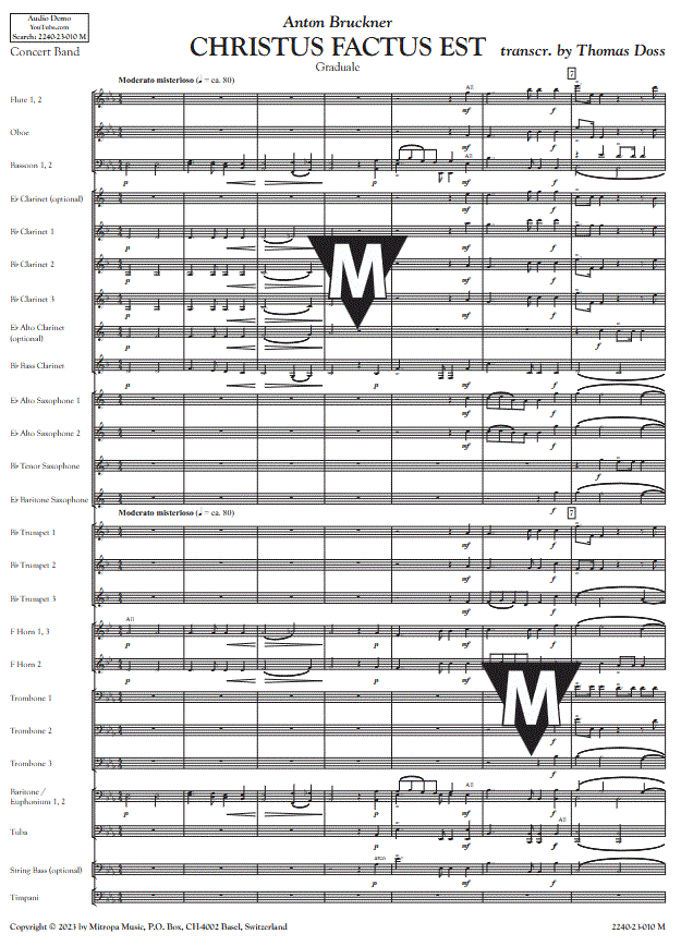 Ulteriori informazioni / contenuti Thomas Doss ha creato questo arrangiamento stimolante e di facile esecuzione per orchestra di fiati del mottetto di Bruckner del 1884, Christus factus est (WAB 11). Dopo la Messa del Giovedì Santo del 1844 e un mottetto per coro misto a otto voci, tre tromboni e archi ad libitum del 1873, questa fu la terza composizione di Bruckner del graduale latino (canto gregoriano) omonimo. L'influenza di Wagner è inconfondibile.