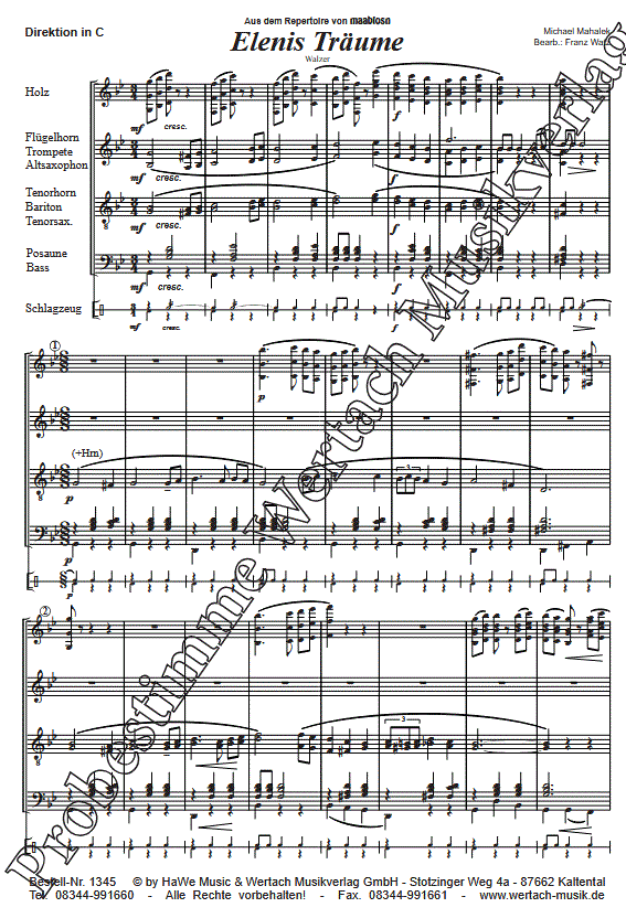 Ulteriori informazioni / contenuti Michael Mahalek racconta la storia del mondo onirico di sua moglie Elena in questo splendido valzer. La sezione dei legni intreccia i motivi presentati dagli ottoni prima che ne derivi un dialogo tra i registri. Il tema continua a intrecciarsi con ricorrenti passaggi solistici per legni e ottoni, che, come nell'introduzione, vengono condotti a una conclusione armoniosamente appagante.