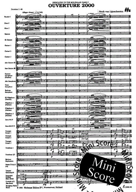 Ulteriori informazioni / contenuti Il numero 2000, per cominciare, è l'anno magico, che si avvicina così rapidamente. Un altro fatto rappresentato da questo numero è che questa ouverture rende la duemila opera pubblicata da "Molenaars Muziekcentrale" dalla sua fondazione nel 1933. Per commemorare questa occasione è stata scritta "Ouverture 2000", dedicata alla famiglia Molenaar. La musica ha un carattere festoso, festoso e dinamico. Alla fanfara d'apertura segue un vasto e virtuoso movimento in cui si può ascoltare un "tiro fuori di tutte le fermate" dei vari registri delle bande del vento.